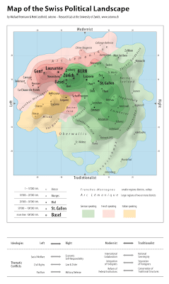 Η ερευνητική ομάδα Sotomo του Γεωγραφικού Ινστιτούτου στο Πανεπιστήμιο της Ζυρίχης αποφάσισε να αποτυπώσει αυτές τις διαφορές σε έναν χάρτη. Αρχικά, κατέγραψε πώς ψήφισαν πόλεις και χωριά σε συγκεκριμένα δημοψηφίσματα (π.χ. του 2002 για την είσοδο της χώρας στον ΟΗΕ και για τη νομιμοποίηση των αμβλώσεων και του 2005 για το σύμφωνο συμβίωσης ομοφυλόφιλων ζευγαριών). Στη συνέχεια, ανάλογα με τα αποτελέσματα,τοποθέτησαν τις περιοχές σε ένα διάγραμμα με δύο άξονες, κάθετους μεταξύ τους. Ο ένας ήταν Αριστερά-Δεξιά και ο άλλος Συντηρητικοί-Φιλελεύθεροι. Ως αριστερές χαρακτηρίστηκαν περιοχές που με την ψήφο τους έδειξαν ότι ενδιαφέρονται για τα κοινωνικά δικαιώματα, το κράτος πρόνοιας και την ειρήνη. Δεξιές θεωρήθηκαν οι πόλεις και τα χωριά όπου οι κάτοικοι βάζουν σε προτεραιότητα το νόμο, την τάξη και την άμυνα. Με τον όρο ‘φιλελεύθεροι’ περιγράφηκαν όσοι υποστήριζαν τη διεθνή συνεργασία, την ενσωμάτωση των μεταναστών και τη μεταρρύθμιση των θεσμών. Αντίθετα, ως συντηρητικοί ορίστηκαν όσοι ήταν υπέρ της διατήρησης της εθνικής κυριαρχίας, των υφισταμένων θεσμών και της απομόνωσης των μεταναστών.